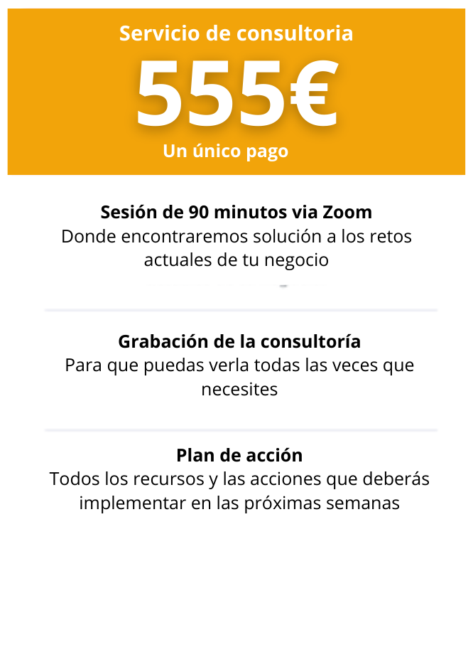 Esta consultoría se centra en descubrir soluciones a los desafíos actuales de tu negocio y en crear un plan de acción que te permitirá enfocar tus esfuerzos en los próximos meses.